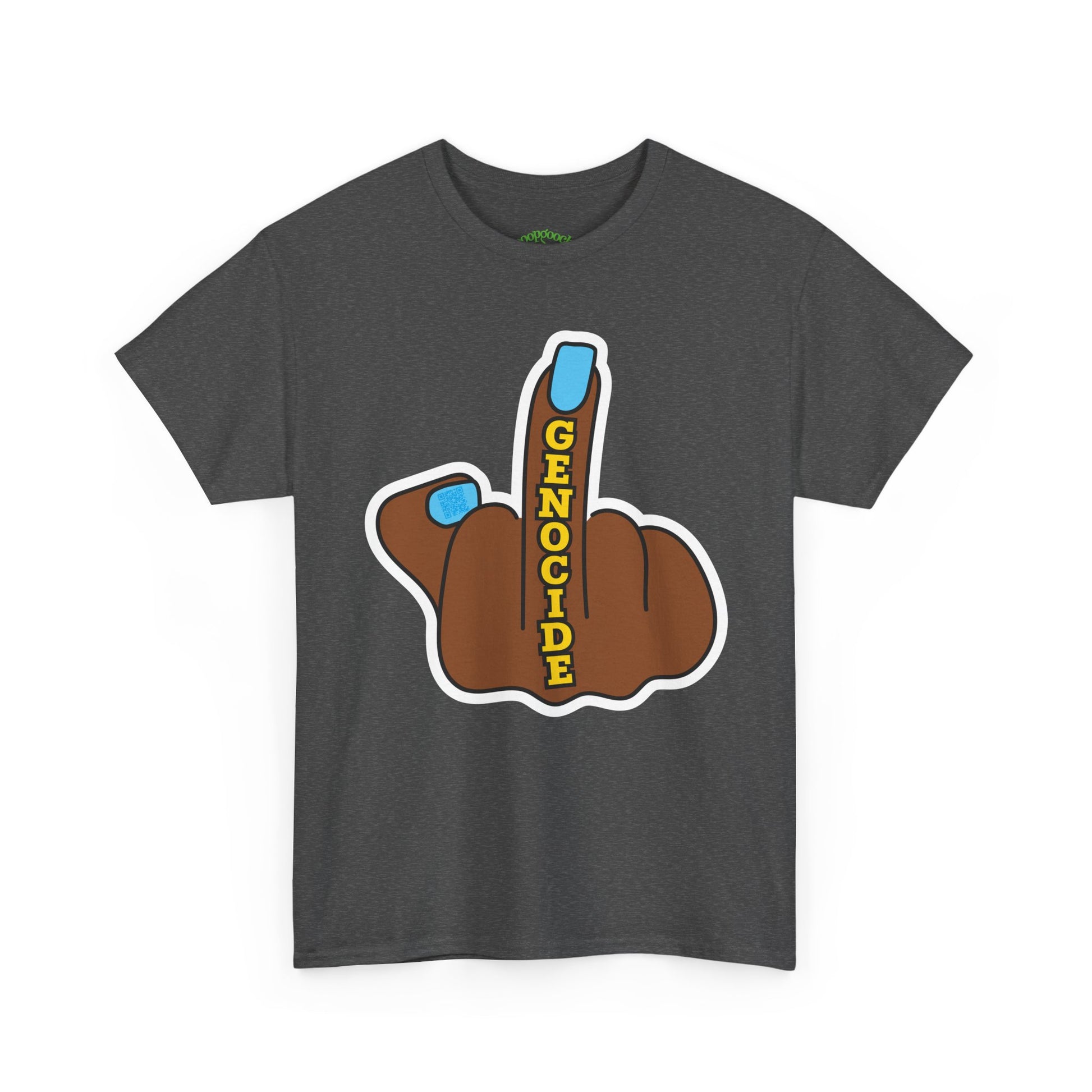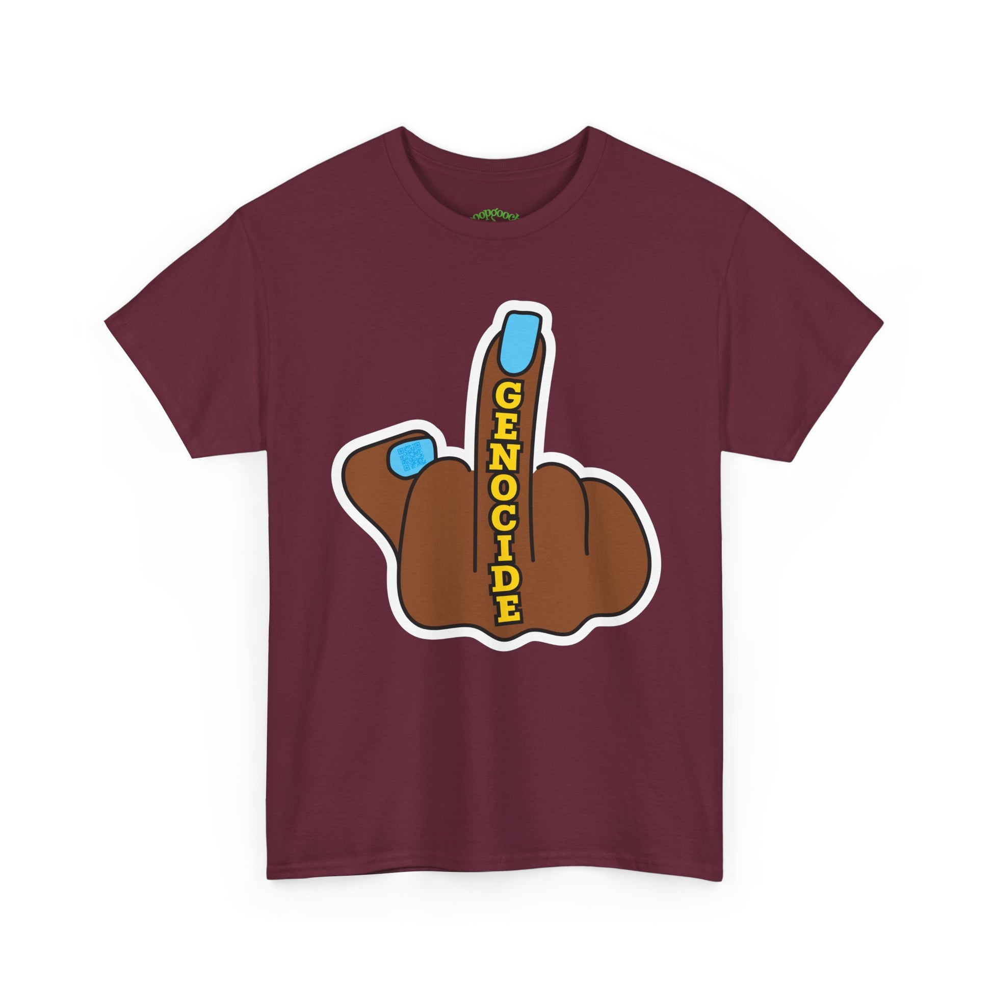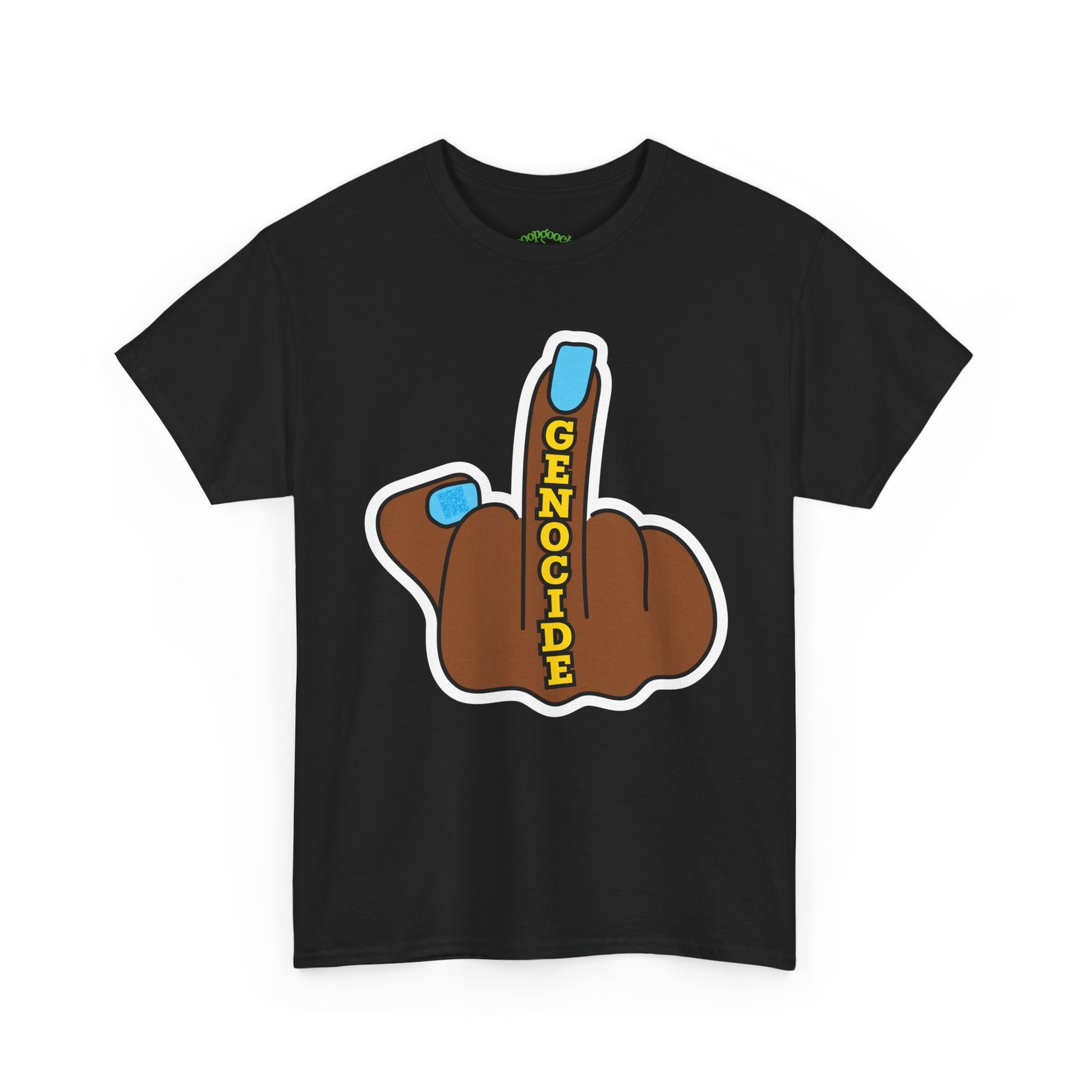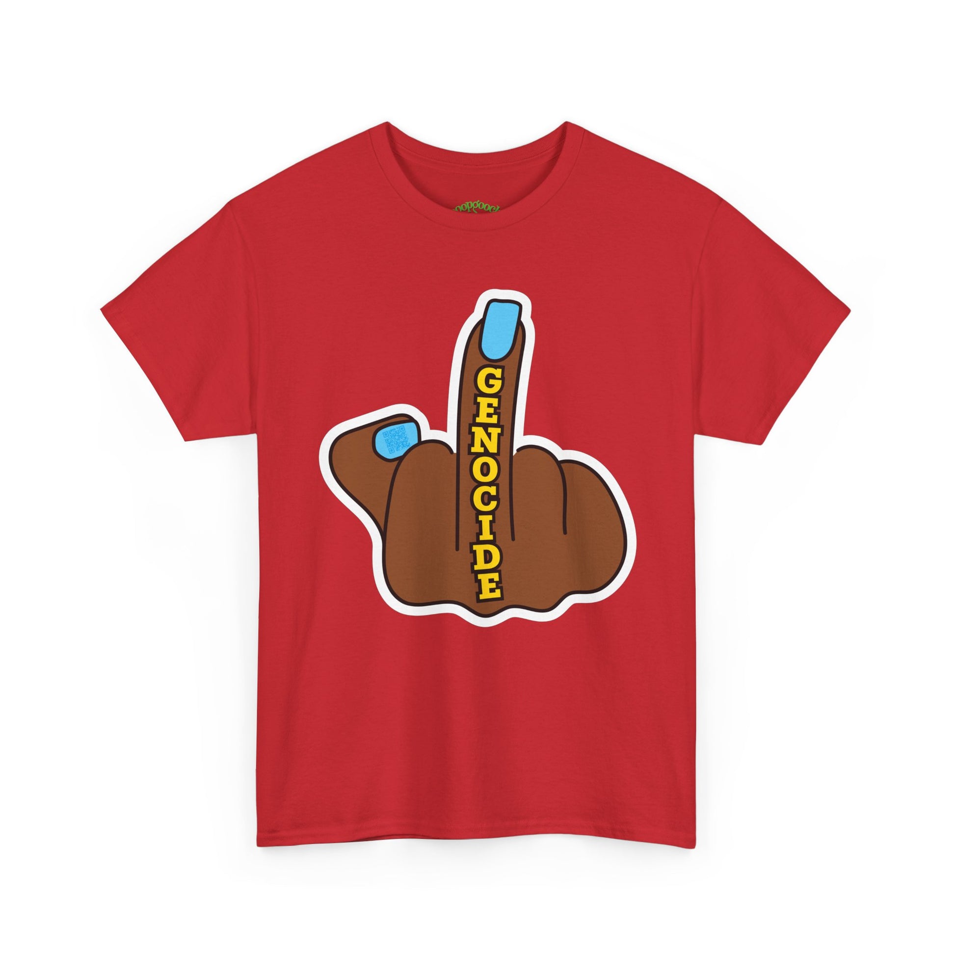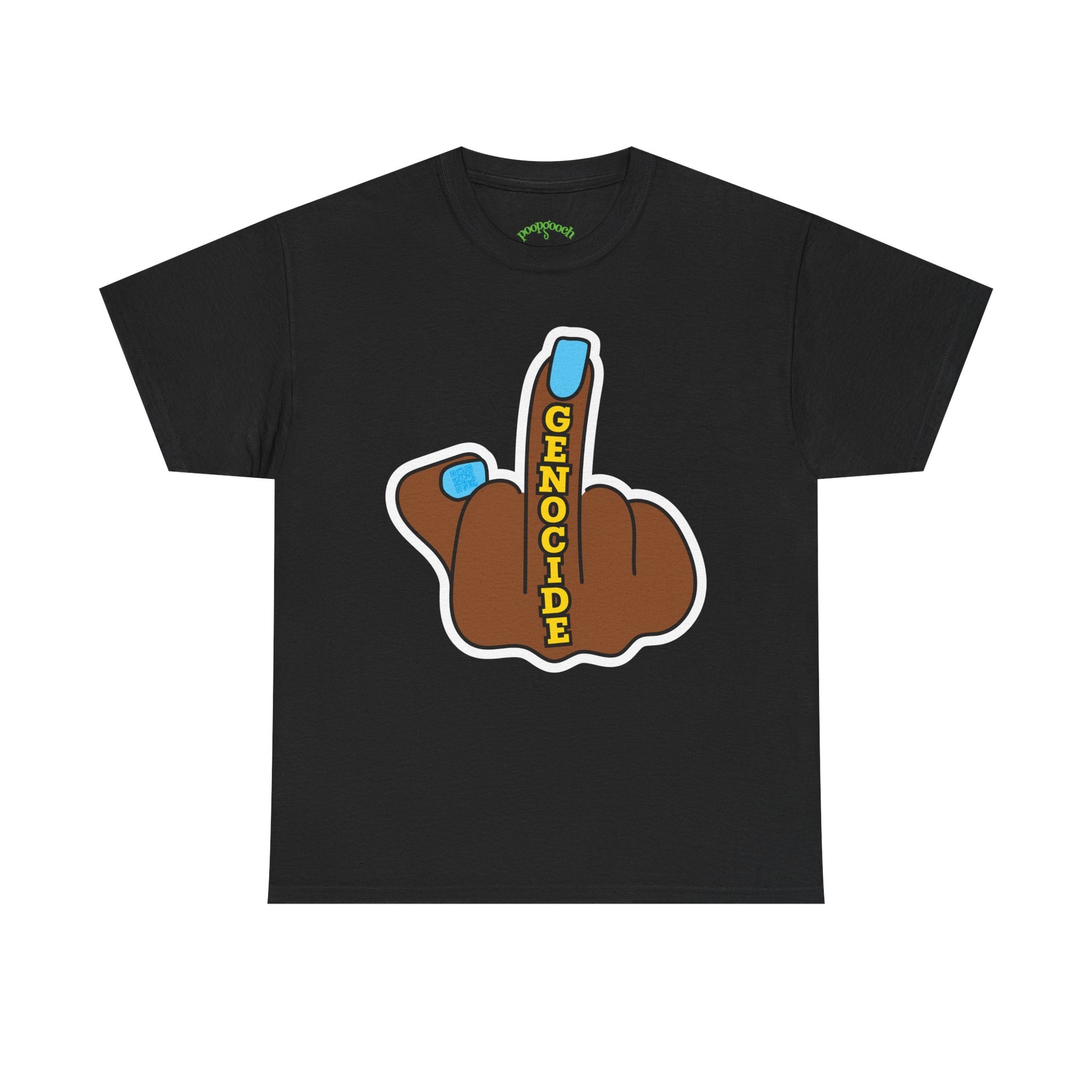 Stand out and make a bold statement with this poopgooch graphic tee featuring a cartoon-style hand with the middle finger raised, accented with the word “GENOCIDE” in bold letters. Printed on a classic short sleeve crew neck t-shirt, this design combines protest art with streetwear style.