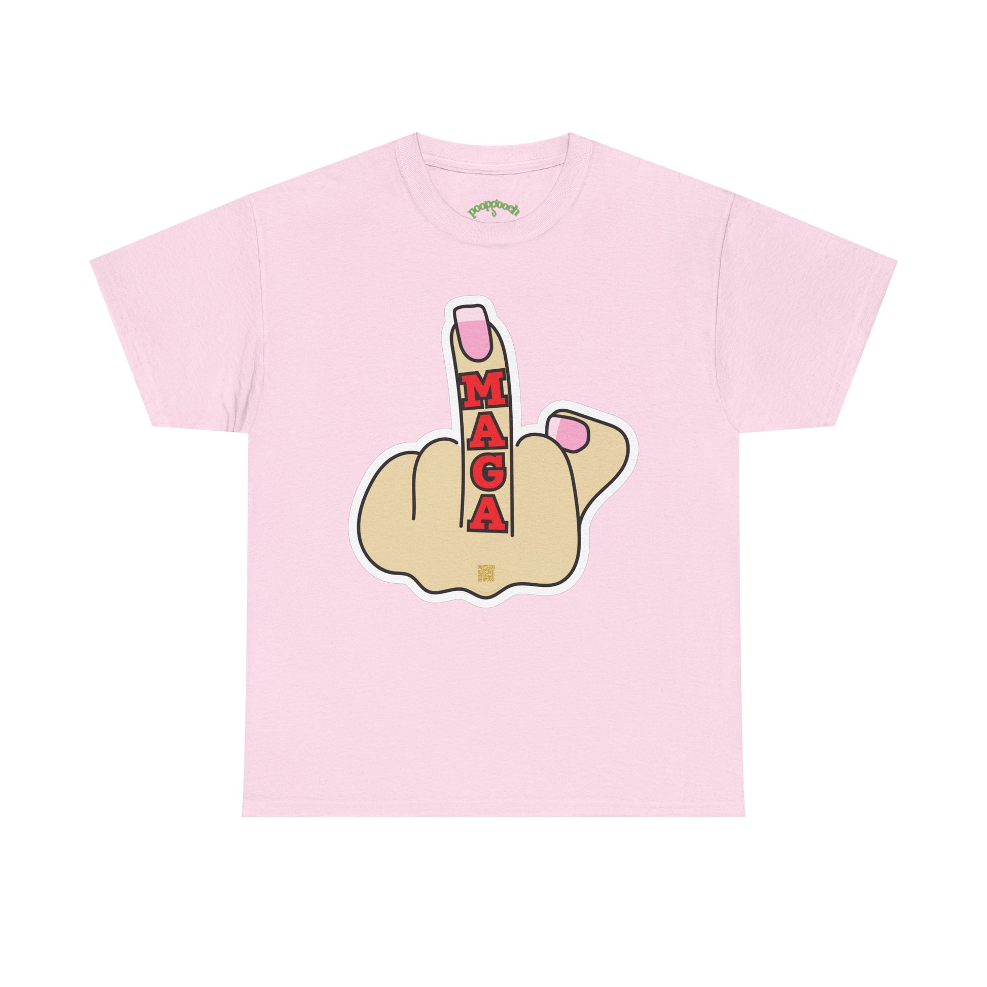 Stand out and make a bold statement with this poopgooch graphic tee featuring a cartoon-style hand with the middle finger raised, accented with the word “MAGA” in bold letters. Printed on a classic short sleeve crew neck t-shirt, this design combines protest art with streetwear style.